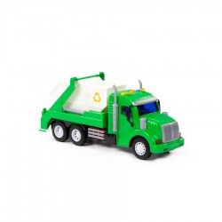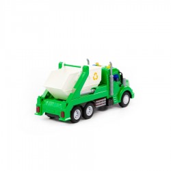 Auto kontejnerové na setrvačník od společnosti Polesie je vysoce kvalitní hračka, jejíž design věrohodně napodobuje skutečné zařízení. Speciální vozidlo má tři páry kol na kovových osách, navíc je vybaveno odnímatelným kontejnerem. Na kabině vozu jsou 4 tlačítka pro ovládání zvukových a světelných efektů.